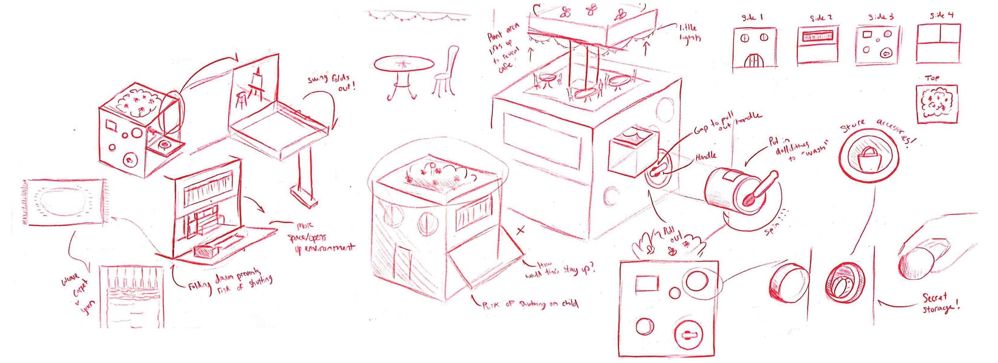 First through sketches and then with cardboard, I explored several different ways that the dollhouse can encourage interaction. With ideas like a rooftop garden or a pull out swimming pool, I aimed to find creative solutions and approaches to how someone might play with the dollhouse in order to differ the dollhouse from its more traditional predecessors.