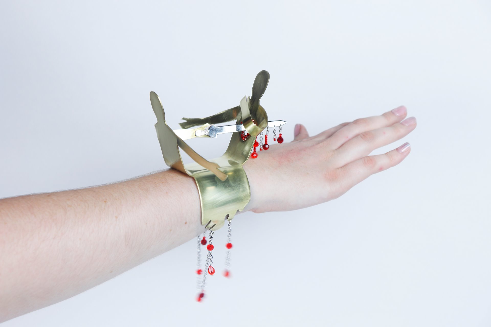 This cuff is designed based off of William Shakespeare’s Julius Caesar and was displayed in Pratt Institute’s Library Adorned show for NYC Jewelry Week in October 2021. I approached this piece with a theatrical and dramatic design. I made the pierced cuff with brass and the sword out of nickel. The figure representing Caesar is embroidered with red glass beads around the pierced heart and glass beads hang from the cuff and sword to imitate drops of blood.