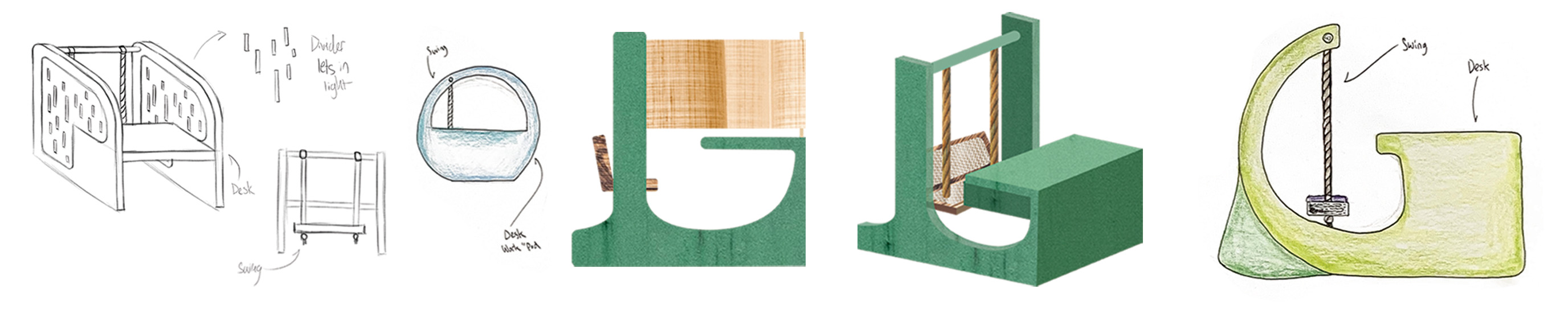 Beginning my 2D ideation I had many ideas in creating a meaningful piece of furniture, but ultimately focused of the swing desk with the intention of combining work and play. You can use this space here to write a bit more about the work you show on the side.