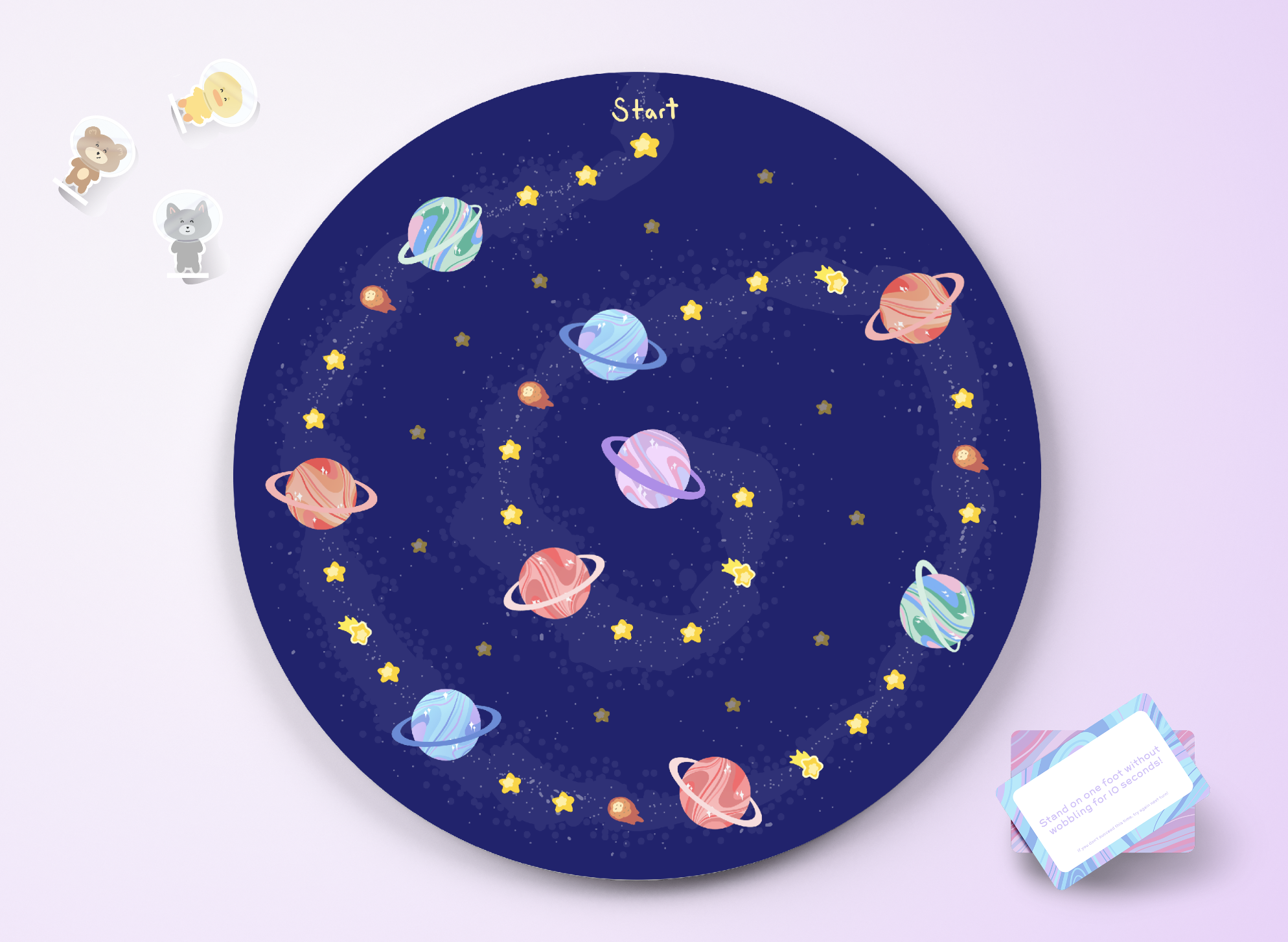 To create the final game board I designed a swirling universe to guide the players through the game. Complete with the challenge cards and the travelers, players are ready for an adventure through space!