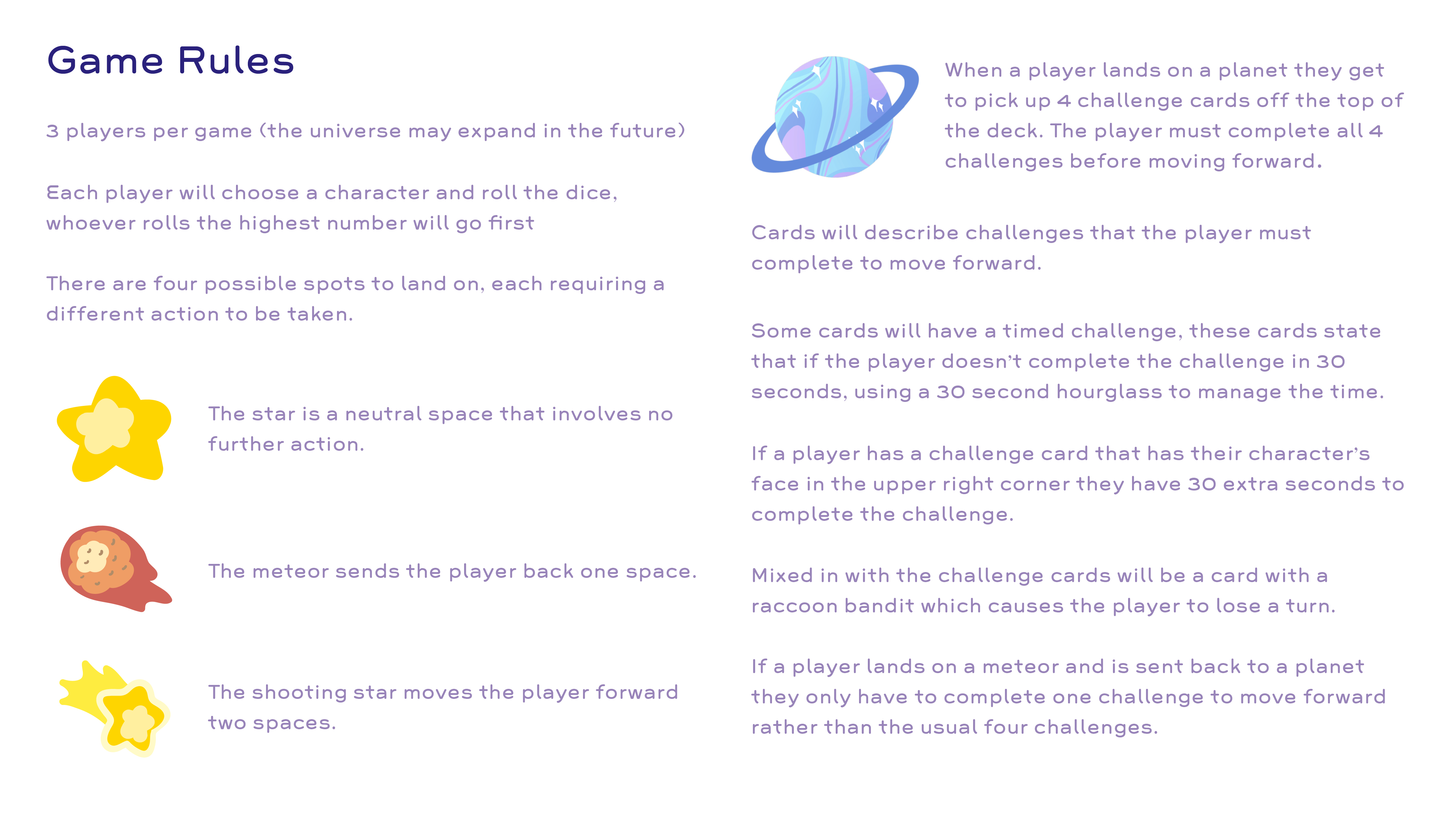My team and I worked together to create a clear and simple set of rules for our game. I designed each of the star, shooting star, and meteor icons to indicate a spot where a player remains in place, has to head back a few steps, or gets to move farther in their adventure. The planet icon prompts the use of cards created to give the players some fun challenges!