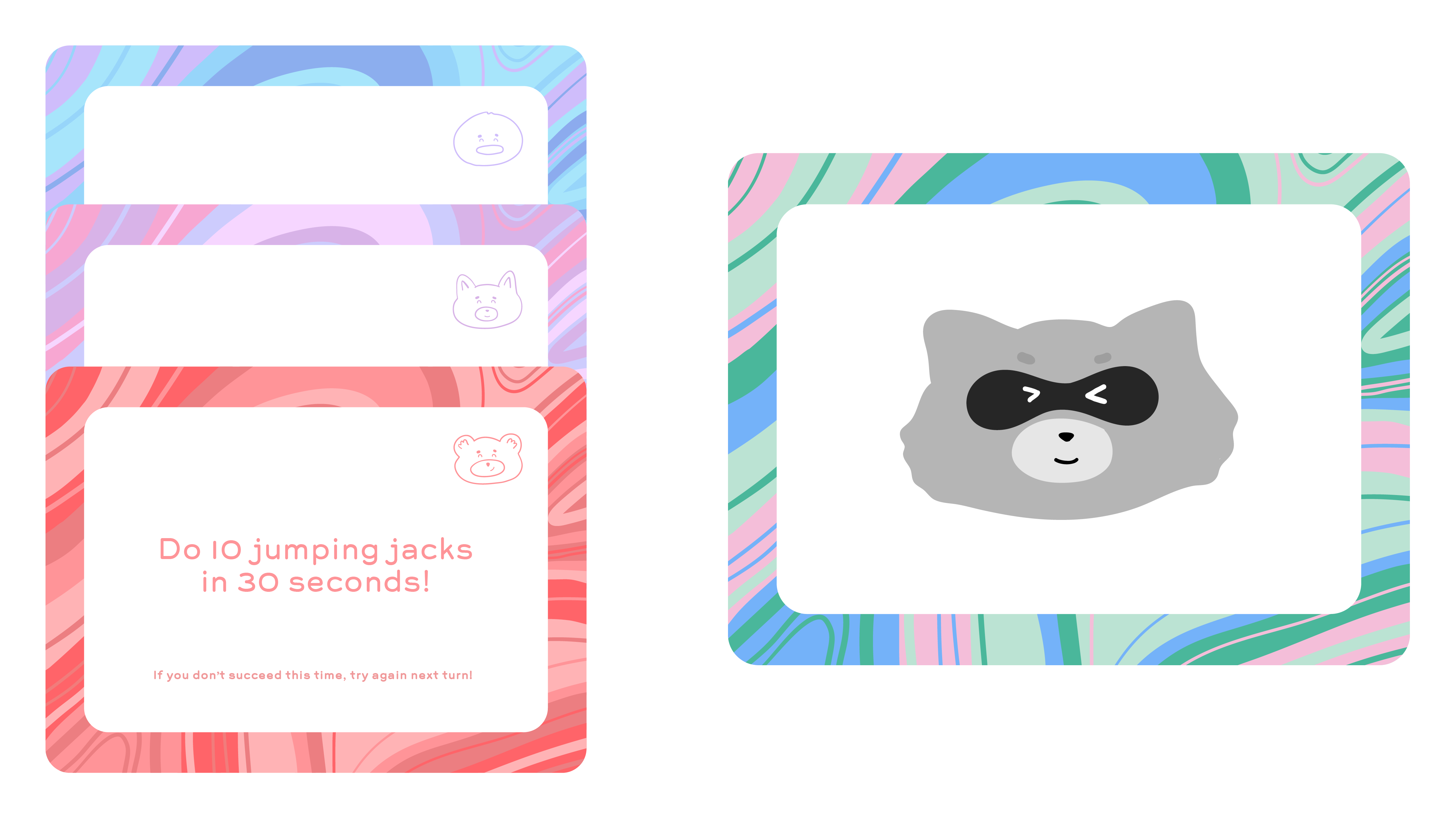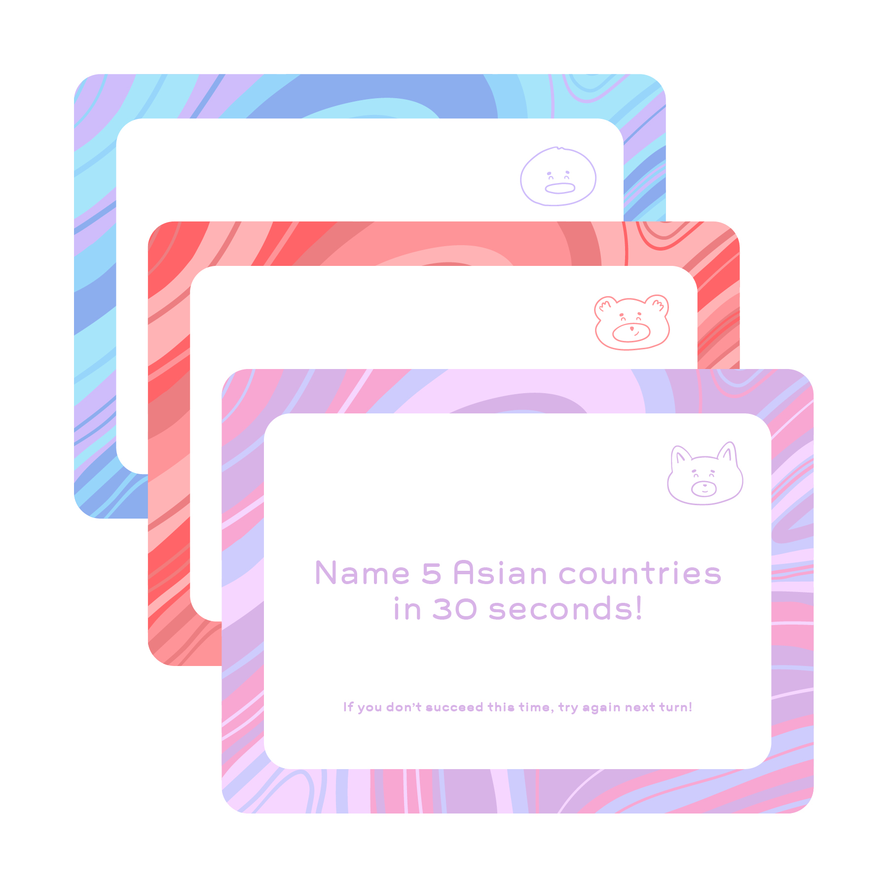 Together with my team we created challenges in three categories: knowledge, creativity, and action. The characters’ faces appear on the cards where they have an advantage to a challenge.
